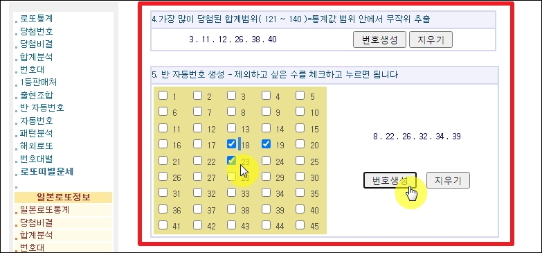 사람마다 로또 복권을 구입할 때 선호하지 않는 숫자가 있을 수 있습니다. 이런 경우에는 5번째 추첨기를 이용해 보세요. 제외하고 싶은 수를 체크하고, [번호 생성] 버튼을 누르면 6개의 숫자 조합을 받아 볼 수 있습니다.