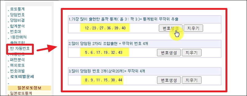 앞서 이용한 통계 자료인 1등을 많이한 숫자, 2자리 조합, 홀짝 조합을 가지고 만들어진 추첨기를 이용해 볼 수 있습니다. 무료이고, [번호 생성] 버튼을 누르면 계속 추천을 받아볼 수 있어요.