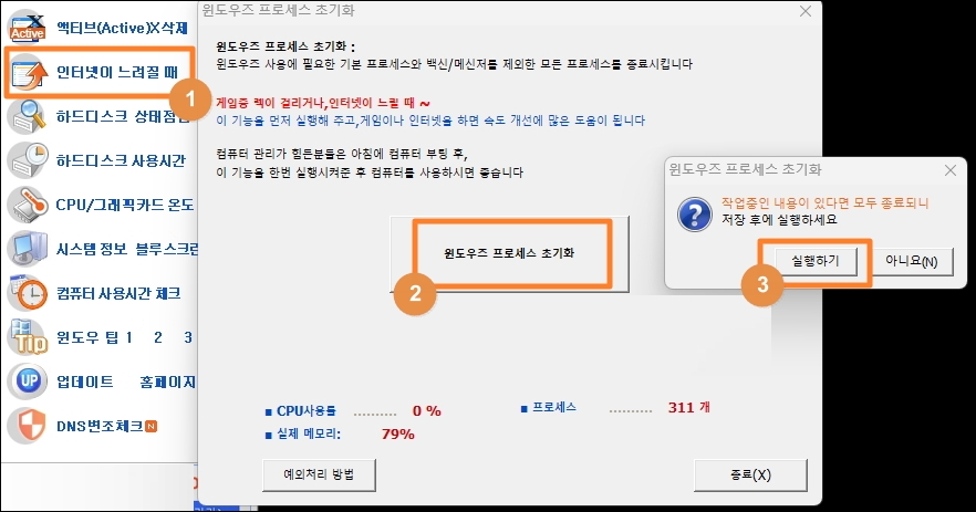 이번에는 윈도우즈 프로세스 초기화 하는법 입니다. 이 방법을 이용하여 인터넷 속도를 빠르게 할 수 있는데요. 인터넷 속도가 빨라지면 컴퓨터의 속도 또한 덩달아 빨라지기 마련입니다. 이 또한 컴퓨터 속도 빠르게 하는법에 해당한다고 할 수 있죠. 사용 방법은 간단한데요. 화면 중앙에 있는 [윈도우즈 프로세스 초기화] 버튼을 클릭한 후 [실행하기] 버튼을 누르면 됩니다. 쾌적한 환경에서 PC를 사용하고 싶다면 아침에 한 번씩 이 기능을 사용해 주세요.