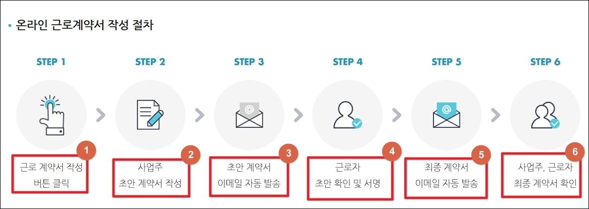 2023년 표준 근로계약서 양식을 다운 받지 않고, 바로 온라인 사이트에서 해당 계약서를 작성하는 것도 가능한데요. 이 경우에는 사업주가 초안 계약서를 작성하면 이메일을 통해 근로자에게 자동으로 발송이 됩니다. 그럼 근로자는 이를 확인 및 서명하면 되고요. 마지막으로 최종 계약서 이메일 자동 발송 후, 사업주와 근로자 모두 최종본을 확인하게 됩니다.