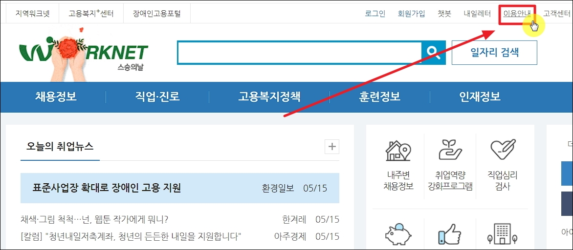 워크넷 홈페이지에서 최신본(2023년) 표준 근로계약서 양식을 다운 받거나 온라인 상에서 바로 작성을 할 수 있는데요. 이를 위해서는 사이트 상단에 있는 [이용 안내] 버튼을 클릭해 주세요.