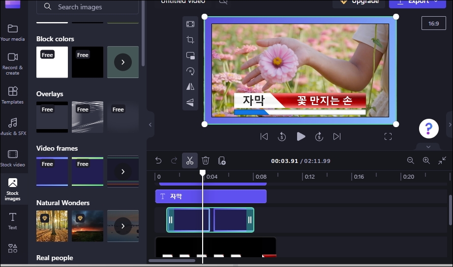 [Strock images] 메뉴를 선택하면 우리가 제작하는 동영상에 다양한 이미지 요소를 추가할 수 있습니다. 일반 도형, 배경, 액자, GIPHY 등 다양한 요소를 무료로 제공하고 있어요. 마우스로 클릭하여 쉽게 구현할 수 있습니다.