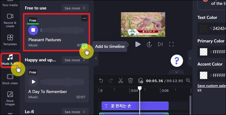 이번에는 [Music & SFX] 메뉴를 클릭해 보세요. 그럼 배경음악을 추가할 수 있습니다. Clipchamp은 무료로 사용할 수 있는 음악 소스를 다양하게 제공하고 있는데요. 음악 파일이 준비되지 않은 상태라면 프로그램이 제공하는 Free 표시된 음원을 사용하면 됩니다. 플러스 버튼을 클릭하거나 타임라인으로 옮기면 쉽게 배경음악을 적용할 수 있습니다.