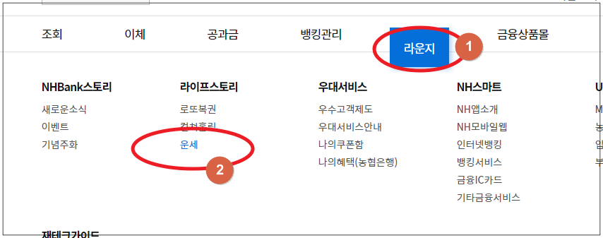 8. 농협 홈페이지에서 라운지 메뉴를 선택ㄹ해 보세요. 누구에게나 무료로 제공하는 운세 서비스를 찾을 수 있습니다. 좌측에서 2번째 위치에 있어요.