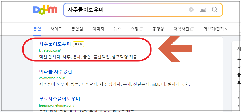 1. 우선 다음 사이트에서 사주풀이도우미를 검색해 보세요. 여러 가지 사이트가 나타나지만, 여기서 제가 추천 드리는 것은 fateup 닷컴 사이트입니다. 다음 단계로 넘어가면 바로 아시겠지만, 꽤 전문적입니다.