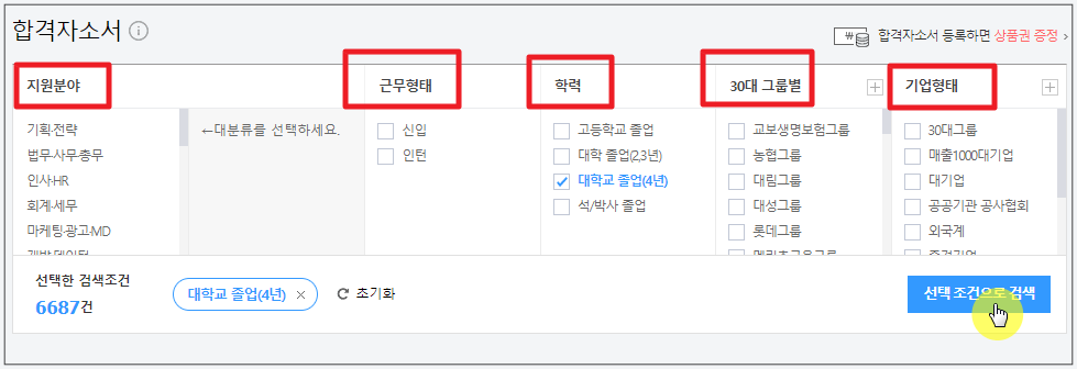 5. 합격 자기소개서 페이지가 열리면 엄청나게 많은 성장과정 자료를 만나 볼 수 있는데요. 너무 자료가 많기 때문에 필터 기능을 통해 어느 정도 자신에게 맞게 줄이는 것이 좋습니다. 지원분야, 근무형태, 학력, 기업형태 등으로 필터 설정이 가능해요.