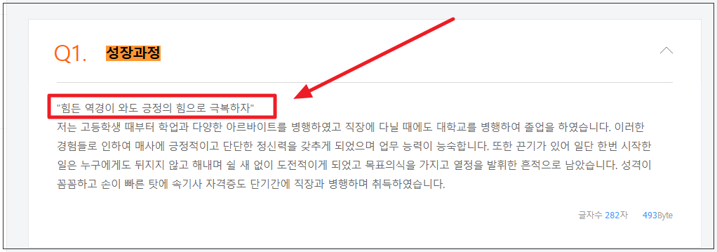 인사 담당자 입장에서도 시간이 부족하면 다 읽어 보지 않고, 소제목만 읽어 볼 수 있는데요. 여러 가지 상황에 대비하여 나의 성장과정을 한 줄로 어떻게 표현할지에 대해 생각을 많이 해 보는 것이 좋을 것 같습니다.