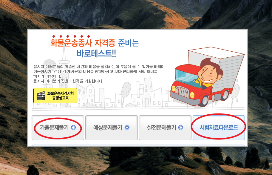4. 화물 운송 자격 시험에 관련된 자료와 서비스가 나타나는데요. 일단 기출문제를 풀기전에 시험 자료 다운로드 메뉴를 선택해 보세요.