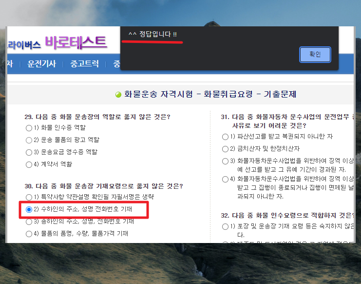 1. 이번 시간에 사용 해 보려고 하는 화물운송자격시험 기출문제 화면입니다. 컴퓨터로 바로 풀어 볼 수 있도록 되어 있는데요. 인쇄할 필요가 없어서 프린터기가 없어도 됩니다. 그냥 화면에 답이라고 생각되는 선택지를 마우스로 클릭하면 돼요. 그럼 바로 정답이나 오답 여부를 확인할 수 있습니다.